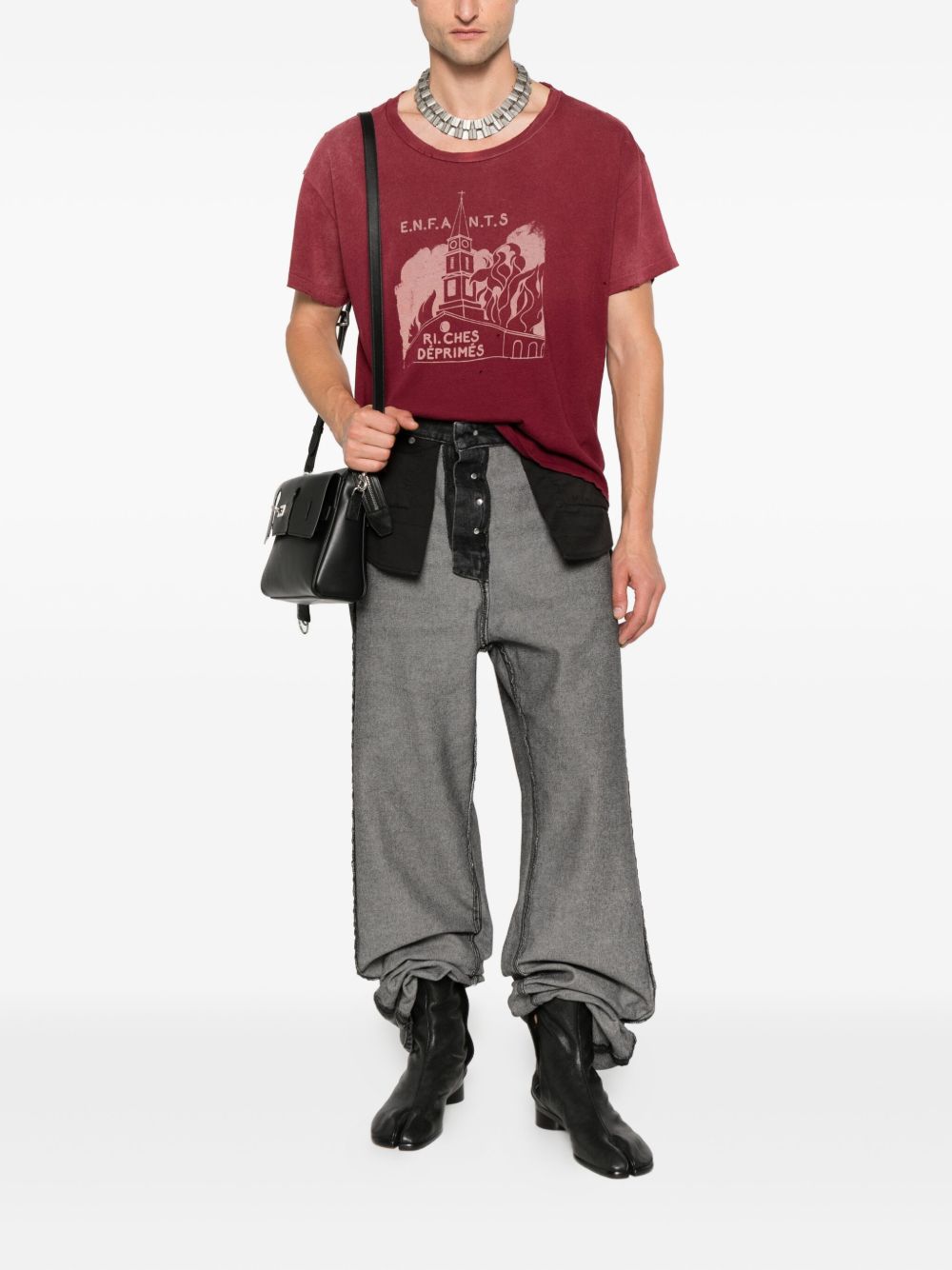 ENFANTS RICHES DÉPRIMÉS(アンファン リッシュ デプリメ)は、憂鬱で裕福な子供たちという意味を持つブランドです。2012年にコンセプチュアルアーティストであるアンリ アレクサンダー レヴィ(Henri Alexander Levy)が設立したロサンゼルスとパリを拠点とするアヴァンギャルドなラグジュアリーファッションブランド。 このブランドは、1970年代末のフレンチパンクと1980年代の日本アヴァンギャルドを融合させたスタイルを掲げ、DIY精神やデコンストラクションを通じて「エリート主義とパンク」を同時に体現する、意図的に排他的な哲学を持ちます。 手描き風のグラフィックや破れ加工を施したTシャツ、限定生産のレザーアイテムやジャケットなどが特徴的です。