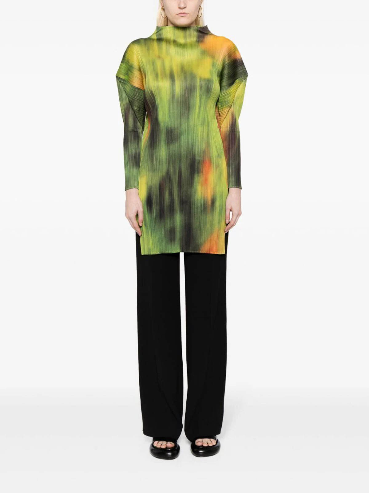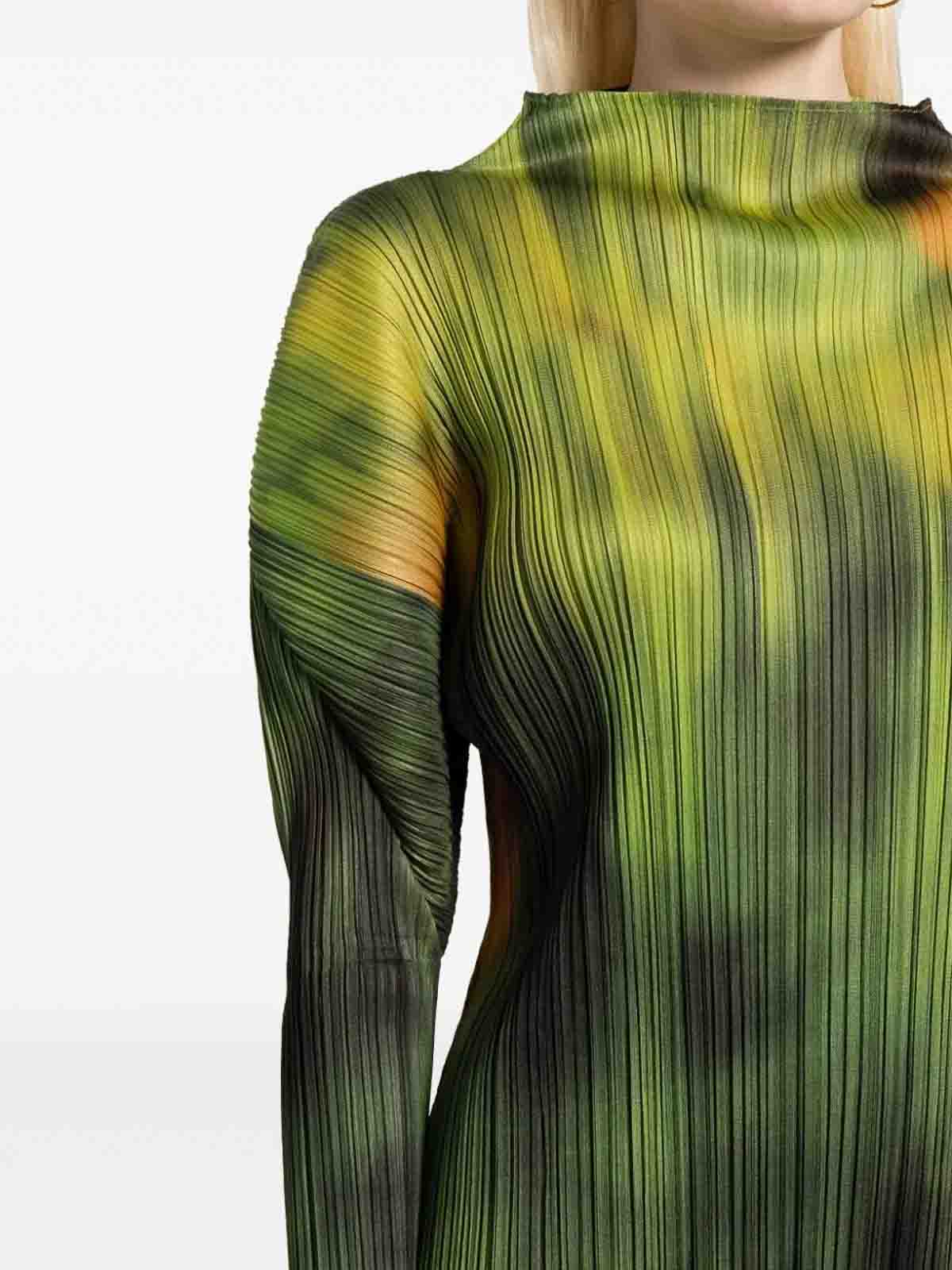 1994年に単独ブランドとしてスタートしたPLEATS PLEASE ISSEY MIYAKE(プリーツ プリーズ イッセイ ミヤケ)は、ISSEY MIYAKEウィメンズコレクションで初めて発表された「プリーツ」を基に展開しました。特筆すべきは「製品プリーツ」と呼ばれる技法で、1本の糸から素材を開発し、縫製後にプリーツをかけることで、軽く、着やすく、水洗い可能な機能的な衣服を実現しました。このアプローチにより、身体に馴染むシルエットと動きに適応する衣服が生み出されました。イッセイ ミヤケの製品プリーツは、現代の着る喜びと自由に応え、独自の創造力を魅せています。
